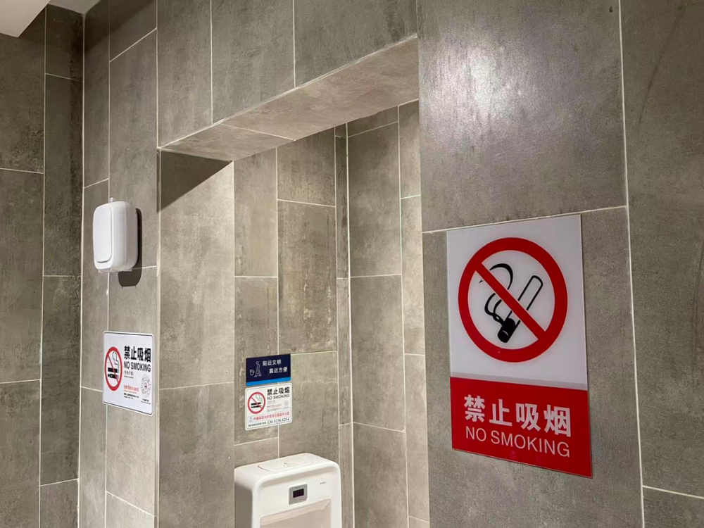 随着投诉次数增加,男厕里的禁烟标识也越贴越多:门口、墙上,甚至小便池上方都贴了显眼的标识。
