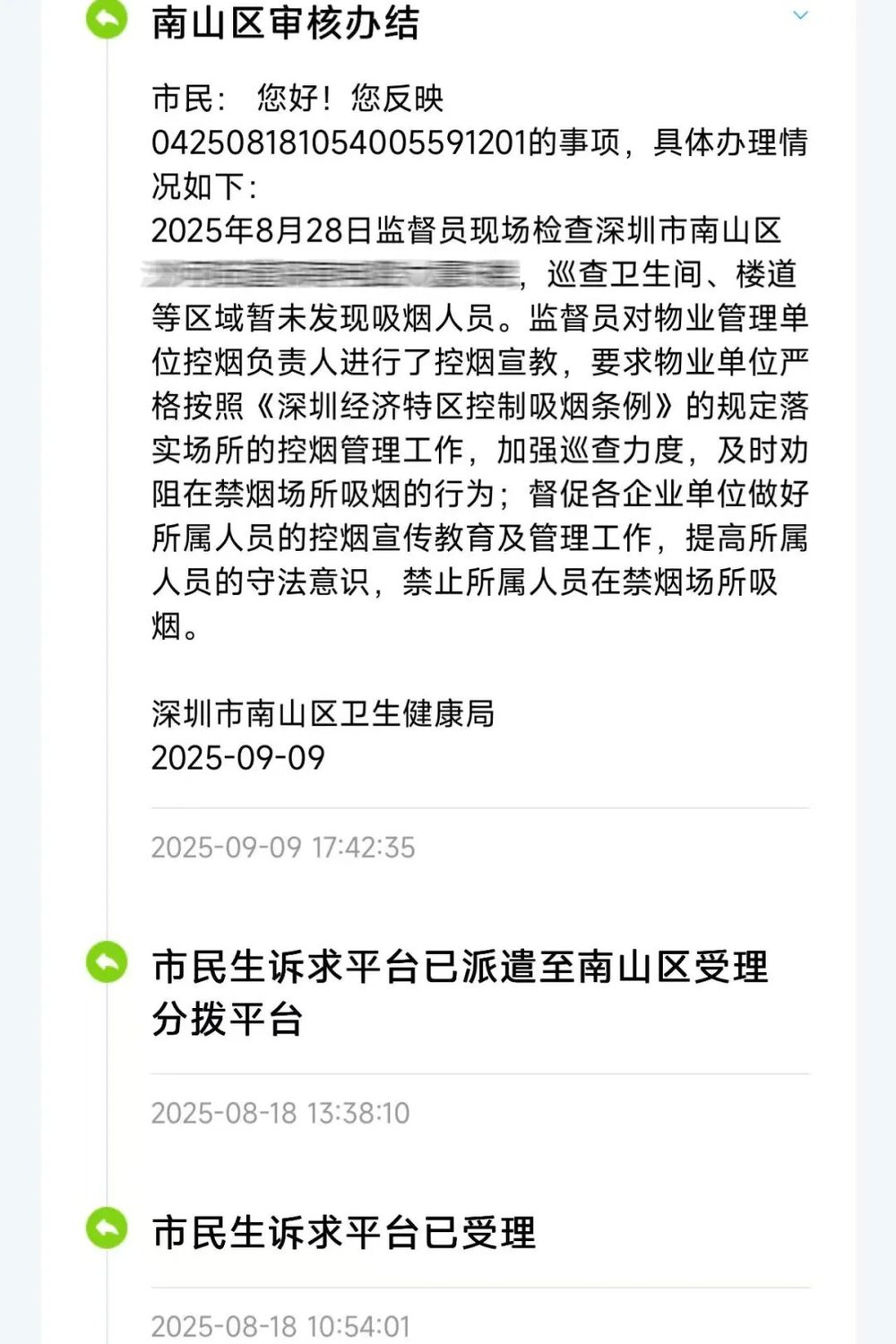 投诉渠道是有,但处罚软,权责在实际问题处理中不甚分明。物业没有执法权,真正有执法权的人,通常很难现场抓到违规吸烟的人。正如投诉结果一样:“暂未发现吸烟人员。”