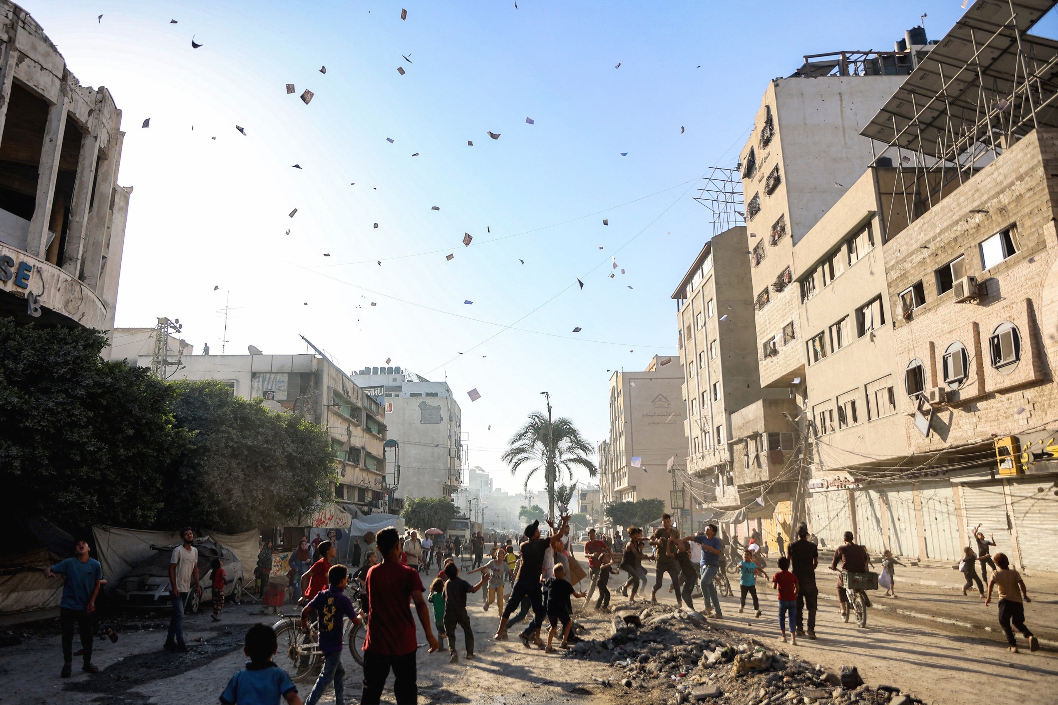 以色列军方向加沙城空投撤离令传单,加沙地带。9月9日,以色列军方宣布将全面进攻加沙城,要求该地区约100万居民自行撤离至加沙南部沿海的马瓦西地区。以色列军方当天对访问卡塔尔首都的哈马斯谈判代表团发动空袭,造成至少6人死亡。卡塔尔外交部谴责以色列的行为构成「国家恐怖主义」。伊朗、沙特、阿联酋、土耳其、西班牙等国均已发表声明谴责以色列袭击公然侵犯卡塔尔主权和领土完整。摄影师:Omar Al-Qattaa