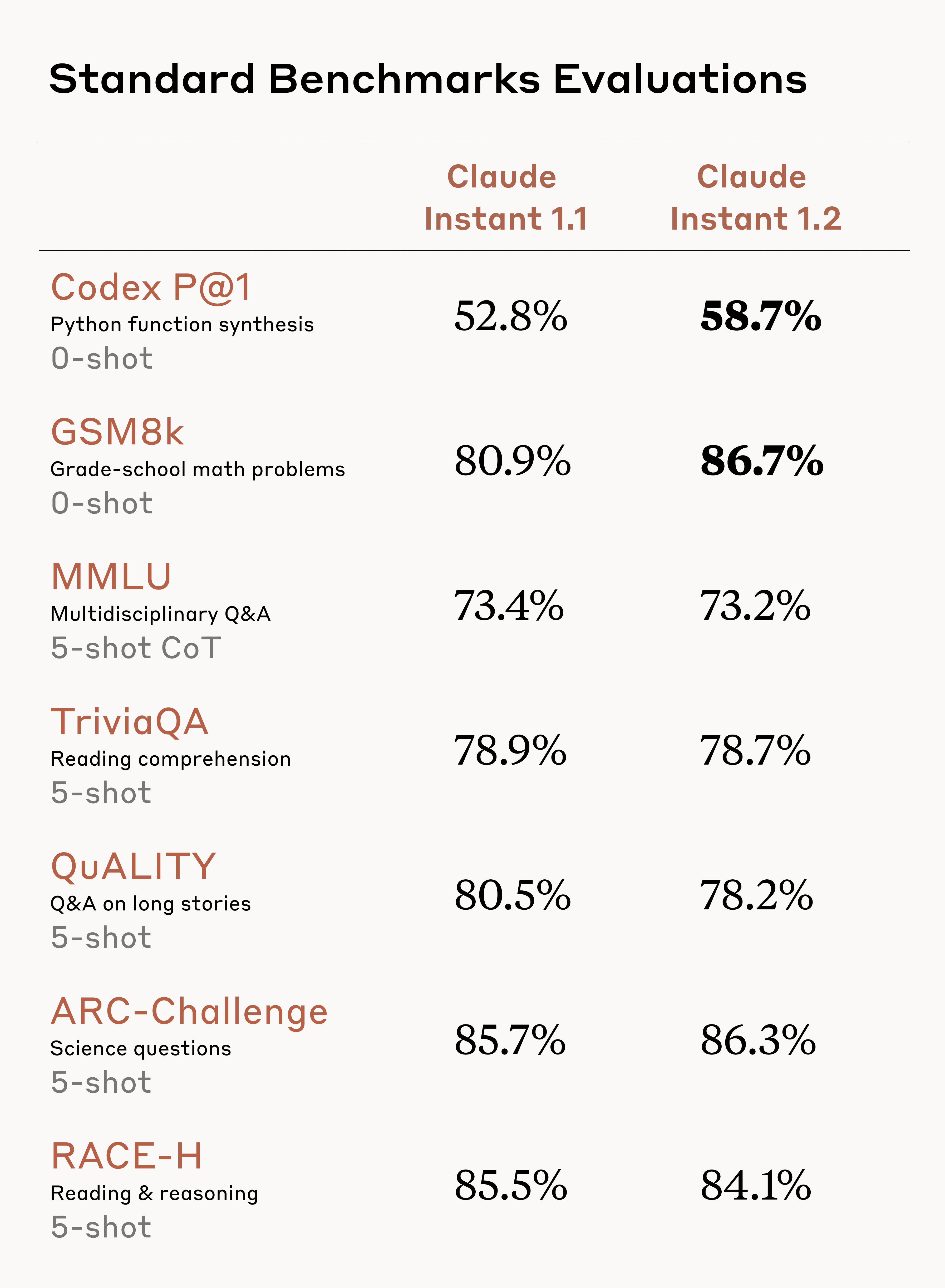 Claude Instant 1.2 outperforms Claude Instant 1.1 on math and coding, achieving 58.7% on the Codex evaluation compared to 52.8% in our previous model. It also scored 86.7% on the GSM8K benchmark, compared to 80.9% for Claude Instant 1.1.