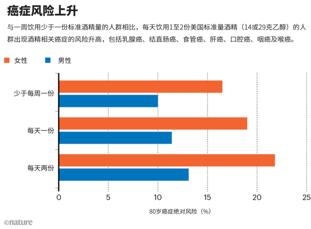 他们2019年发表的研究估算:对于非吸烟者,每周饮用一瓶葡萄酒会使男性终身患癌绝对风险增加1%,女性增加1.4%。这相当于男性每周吸5支香烟、女性吸10支的风险水平。