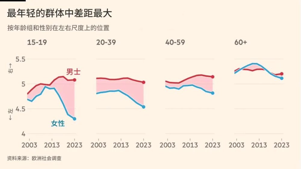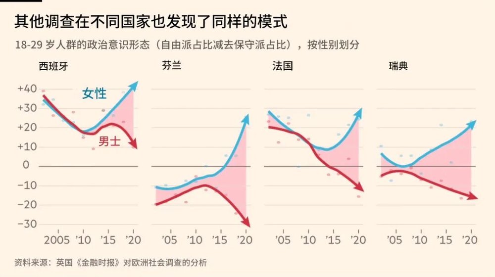 《年轻男女的世界观正在分崩离析,年轻男性成为全球最保守群体》。2024年,FT刊出此篇专栏文章,作者 John Burn-Murdoch 通过详尽的数据,展示了当今最重要的社会趋势之一,新的全球性别鸿沟正在形成,许多国家的青年男女之间正在出现意识形态的极大分歧: