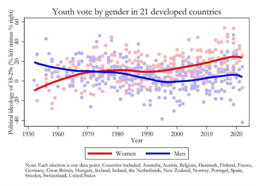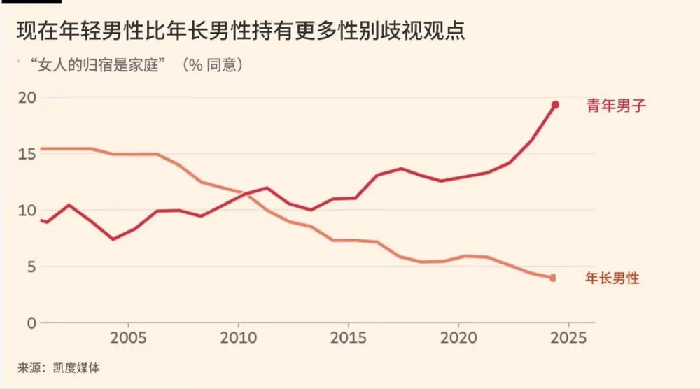 “年轻女性非常进步,而年轻男性则出人意料地保守”。