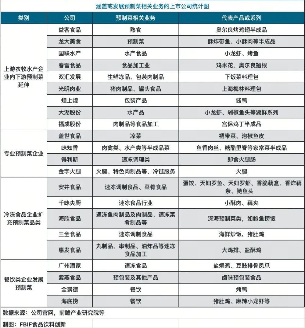 据FBIF不完全统计,目前,上市公司中,涵盖或已经在发展预制菜相关业务的企业可以分为四大类,分别是上游从农牧水产业务向下游预制菜延伸的企业,从冷冻食品扩充预制菜品牌的企业,从餐饮类切入预制菜企业以及专业预制菜企业。