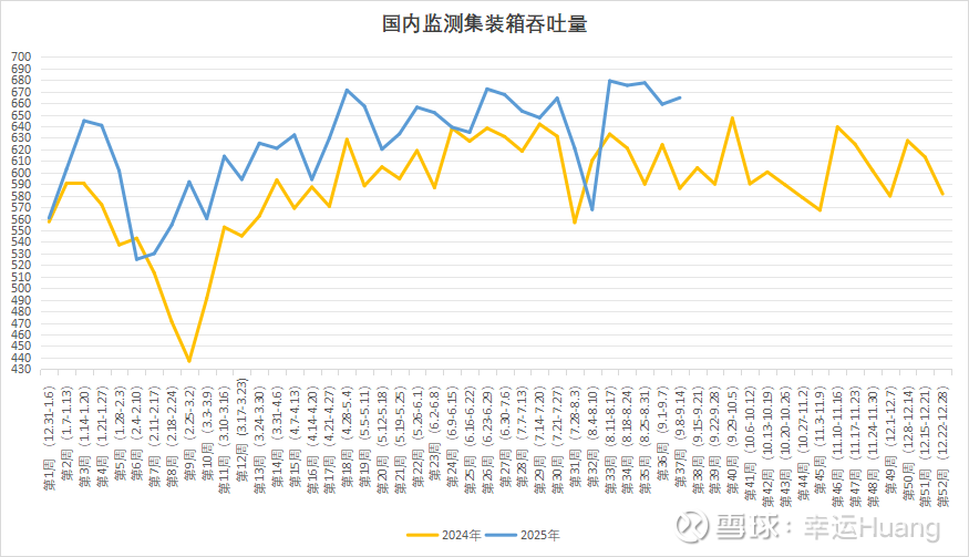 全国重点港口上周的集装箱吞吐量(第36周,每周一更新)环比上涨0.85%至664.6万TEU,依然是历史最高货量数据附近