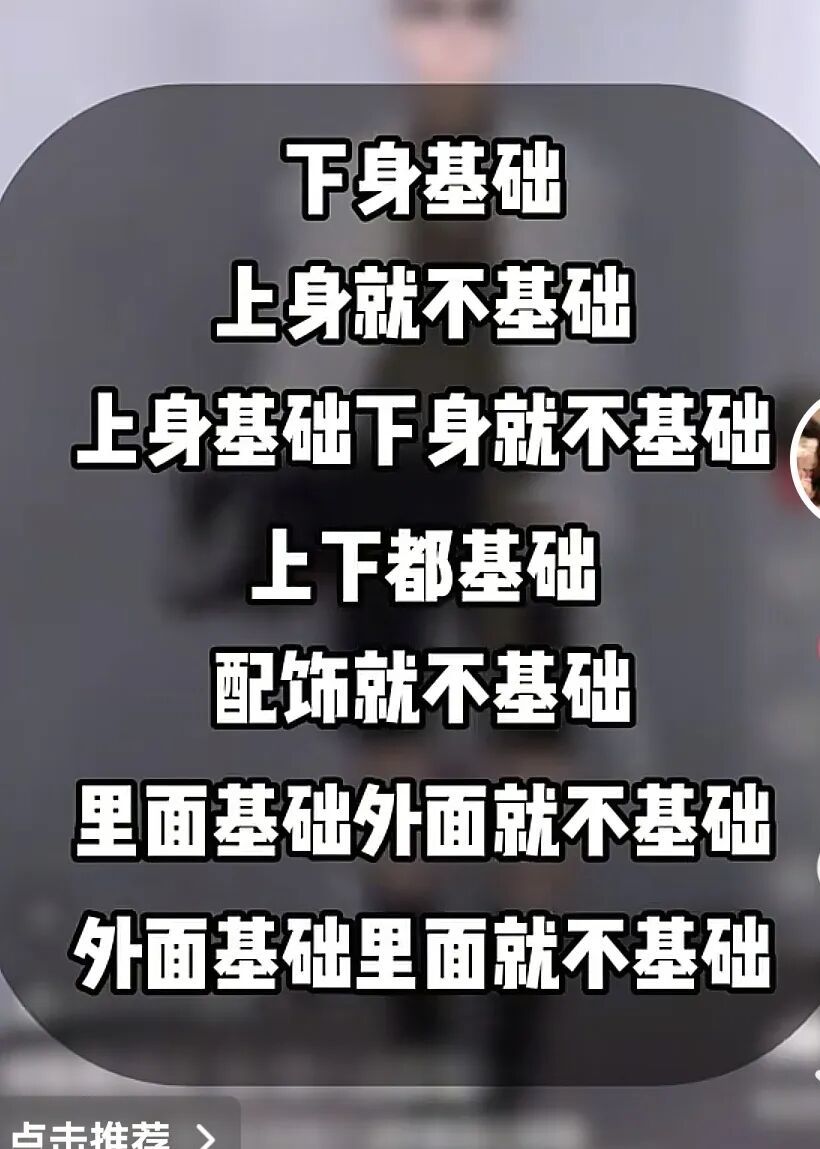 这个名为“穿搭显贵的傻瓜公式”的声音,就像不齐舞团捧红了大展宏图一样,成为短视频的万能文案配音,甚至被演绎出“人基础,内容就不能基础……”等多种文案,成为玩抽象的流行语。