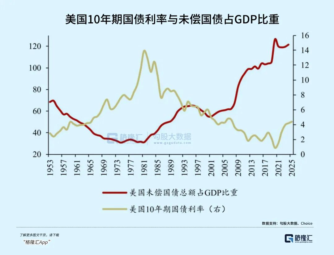 总体来说,从70年代末开始至今,也就是整个信用货币时代,随着债务规模飙升,其利率是在持续下降的。