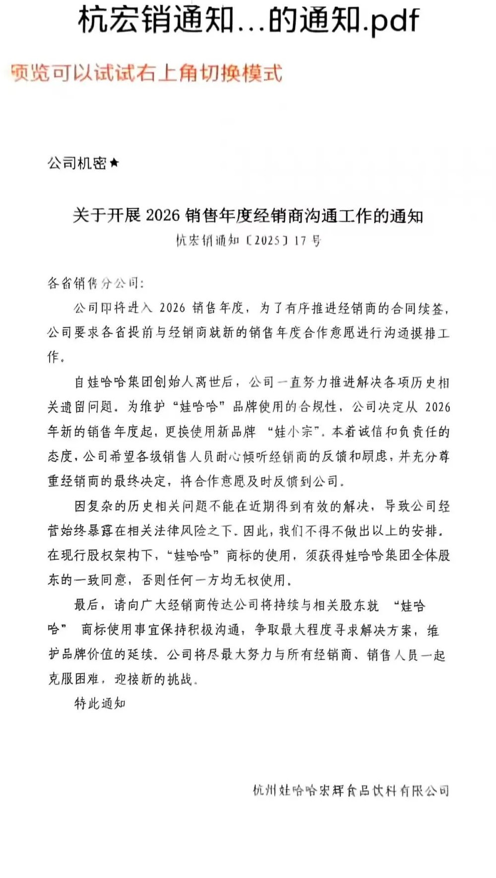 9月13日,一份“关于开展2026销售年度经销商沟通工作的通知”在网上流传。文件中提到,为维护“娃哈哈”品牌使用的合规性,公司决定从2026年新的销售年度起,更换使用新品牌“娃小宗”。因复杂的历史相关问题不能在近期得到有效解决,导致公司经营始终暴露在相关法律风险之下。因此,我们不得不做出以上的安排……