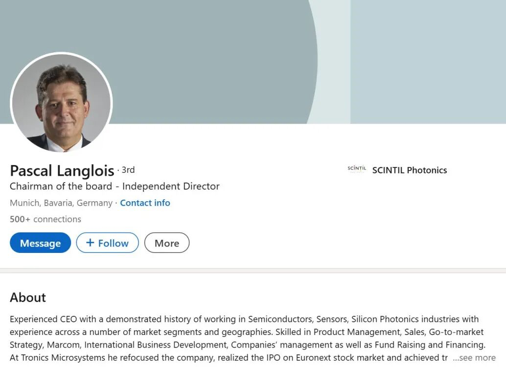成立于 2018 年的 Scintil Photonics 总部位于法国格勒诺布尔市,其创始人是西尔维・梅内佐(Sylvie Menezo)和帕斯卡尔・朗卢瓦(Pascal Langlois)。前者在光通信领域拥有 30 多项专利,发表过众多高影响力论文;后者则拥有超过 25 年的半导体行业高管经验,深谙业务全球化扩张和产品商业化之道。