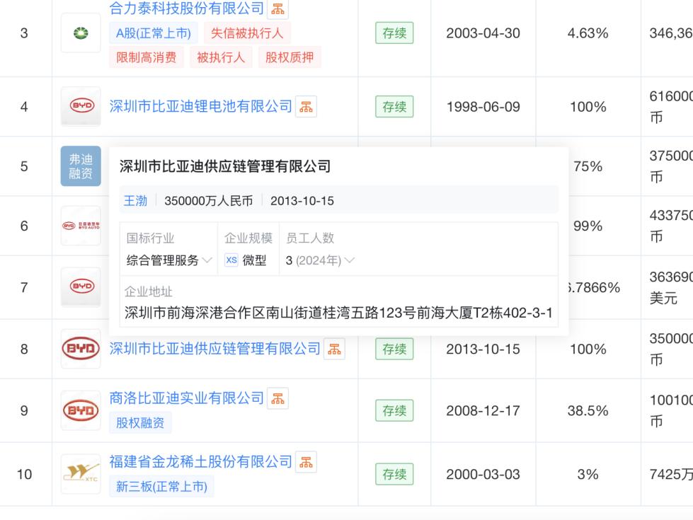 根据天眼查APP显示,比亚迪控股的密密麻麻供应链子公司铺满几屏。