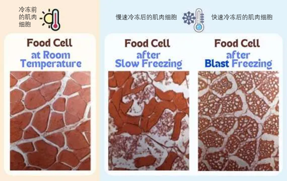 食材内部的总含水量是固定的,降温越迅速,这些水就会以数量更多,但单独体积更小的冰晶的形式变为冰,体积越小的冰晶对细胞破坏程度越低。反之,如果降温慢,冰晶数量少,体积却更大,会显著破坏细胞。