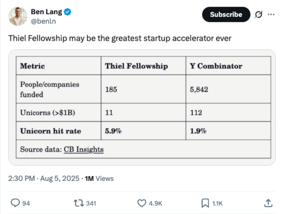 在本月早些时候一张引发病毒式传播但数据存有争议的图表中,该奖学金的投资回报表现甚至击败了被誉为“创业界哈佛”的Y Combinator。