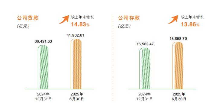 截至2025年6月末,邮储银行公司贷款总额继续提升到41,902.61亿元,较上年末增加5,410.98亿元,14.83%的增速领跑国有六大行。报告期内,公司金融业务收入407.46亿元,同比增长19.99%;公司金融中间业务收入同比增长41.62%。