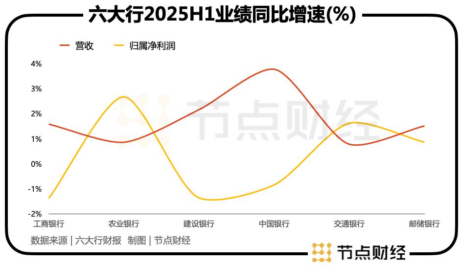 该背景下,邮储银行本期的“双增”答卷,虽然增幅只有1个多点,但仍然凸显了穿越周期的韧性。放置在国有六大行中,也是与农业银行、交通银行并列,营收和归属净利润均正向变化的选手。