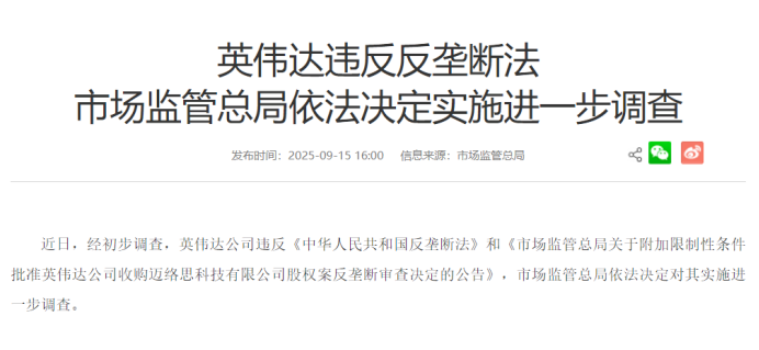 市场监督管理总局9月15日官网的一则通告称,英伟达违反《反垄断法》,市场监管总局将实施进一步调查。