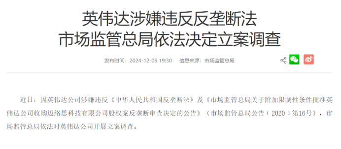2024年12月9日,市场监管总局就曾发布通告,称英伟达涉嫌违反反垄断法,决定立案调查,而此番是确定其违法。