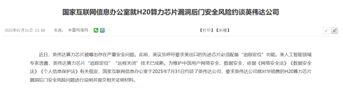 不过,在7月份,中国主管部门已经敲打过一次英伟达。当时,国家互联网信息办公室约谈英伟达,提出其H20算力芯片就漏洞后门安全风险进行说明。