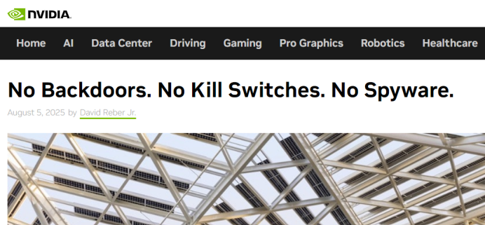 此次发酵之后,英伟达首席安全官David Reber Jr.还特地在英伟达官方网站发布文章说明:英伟达的GPU“无后门、无终止开关、无间谍软件”。