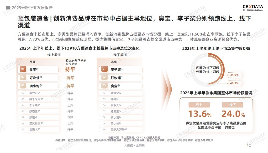 随着米粉的消费场景和市场边界持续拓宽,作为米粉产业的核心板块之一,预包装速食米粉也逐渐形成了初步的市场竞争格局,且头部品牌效应日益增强。从市占表现来看,2025年上半年臭宝以11.6%的份额占据线上渠道榜首,线下则由李子柒品牌以17.7%领先。