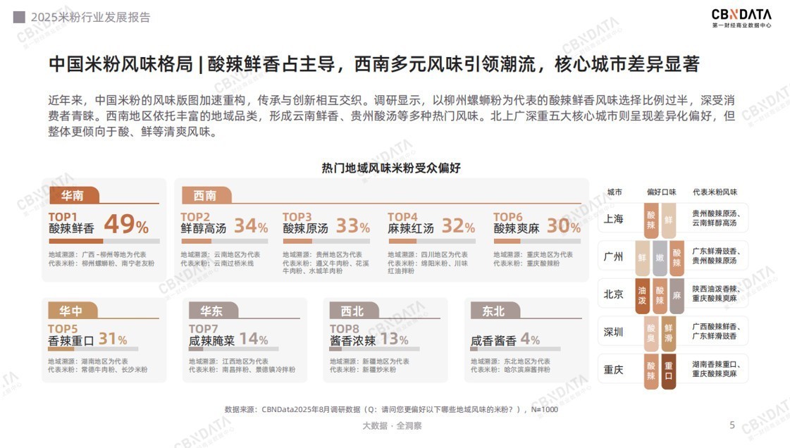 这场变革的背后,是消费端与产业端的同频共振。一方面,年轻化、多元化的消费需求,正驱动米粉在口味、场景上不断创新,使其兼具情绪疗愈、能量补给与社交分享等多重价值;另一方面,资本与新品牌的涌入,则加速推动米粉赛道走向工业化、品牌化和差异化竞争的新阶段。在此背景下,第一财经商业数据中心(CBNData)发布《2025米粉行业发展报告》,通过系统梳理米粉上下游产业链,聚焦核心人群与创新趋势,透过数据揭示行业市场规模与竞争格局,并展望未来发展机遇。一碗粉的进化背后,是味蕾与文化自信的双向奔赴历经两千余年的发展,米粉的形态与工艺已几经迭代,但万变不离其宗——无论外在如何演变,风味始终是最终触达并打动消费者的核心要素。因此,消费者的口味偏好,也成为整个市场发展的风向标。调研数据显示,当下的米粉江湖,以柳州螺蛳粉为代表的“酸辣鲜香”风味一骑绝尘,成为当前市场的绝对主流。从地域溯源来看,西南地区引领着米粉风味潮流——贵州酸汤的浓烈、云南过桥米线的醇厚、重庆酸辣粉的“上头”,各具特色的米粉品类推动地域风味不断破圈。这种口味偏好在核心城市也呈现出鲜明分野:魔都上海偏爱酸辣、鲜香,而山城重庆则将“重口味”贯彻到底。总体而言,清爽酸、鲜风味更符合当下年轻群体对多样化、轻负担的追求。