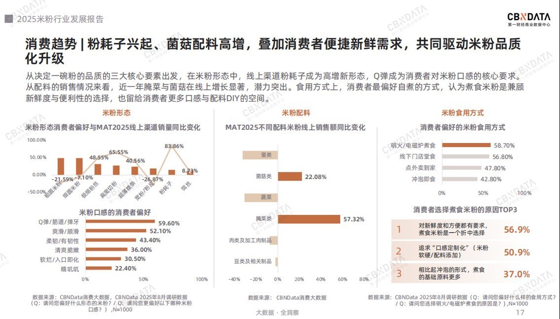 供给侧的核心竞争力进阶也驱动了产品的创新升级,报告进一步洞察了过去一年米粉消费的新趋势。例如,在米粉的形态与配料上,新形态粉耗子、配料腌菜菌菇是近一年销量高增的新趋势;在食用方式上,超半数消费者为了口感定制化与便捷性的双重需求因此更加偏好煮食的形式,多维度的产品需求扩张持续释放产品活力。