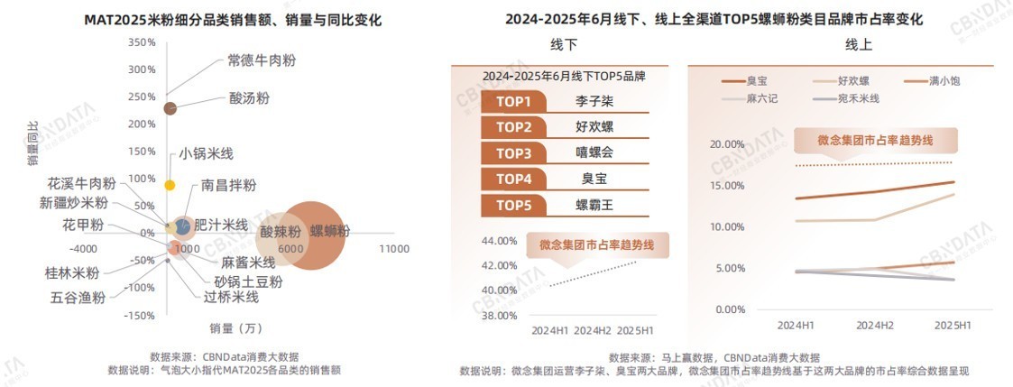 从细分品类看,螺蛳粉在2024年7月至2025年6月期间均稳居米粉细分品类“销冠”,酸汤粉和常德牛肉粉增速迅猛,销售额同比增长均超200%,显示出巨大潜力。而在螺蛳粉细分赛道中,头部品牌格局基本稳定,微念运营品牌推动其市占率占据第一并持续提升。