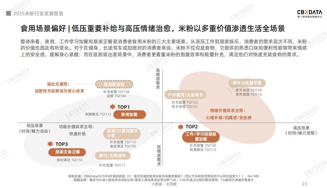 米粉的价值,也已超越了单纯的果腹功能,渗透到生活的全场景中。夜宵、工作加餐和居家正餐是三大核心食用场景。在工作、通勤等高压场景下,米粉是高效的“能量补给站”;而在追剧、独居等低压场景中,它又化身为提供“心理慰藉与安全感”的温暖陪伴。这种兼具功能与情感的双重价值,使其成为现代生活不可或缺的一部分。