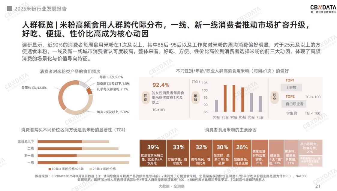 “嗦粉”的千人千面:解码米粉市场的核心消费人群产业侧的品类创新与供应链升级,最终都是为了精准回应人的需求。因此,只有深刻理解“人”,才能真正把握米粉产业未来的生长动力。那么,当下米粉的消费者究竟有着怎样的偏好与诉求?从整体来看,米粉已成为高频刚需的国民餐食。近90%的消费者每周至少食用一次米粉,其中女性和85、95后的上班族是绝对的消费主力。10元到25元是米粉的主流价格区间,其中一线和新一线城市消费者对25元以上的方便速食米粉接受度较高。驱动消费者选择米粉的TOP3动因分别是:好吃(39%)、便捷(33%)和高性价比(32%),这三大核心价值是推动米粉市场扩容的关键。