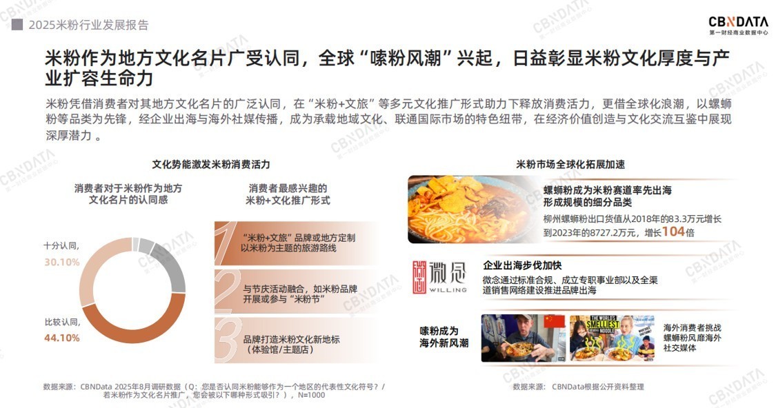 从更广阔的视角看,米粉早已超越食物本身,成为一种被广泛认同的地方文化符号。这份深厚的情感底蕴,将为产业发展带来源源不断的文化活力。超七成消费者认同米粉的文化名片价值,他们对于“米粉 + 文旅” 路线、节庆融合、文化新地标等推广形式有更高的期待。这股文化热潮也加速走向海外,柳州螺蛳粉出口货值自2018年以来增长超百倍,全球“嗦粉风潮”兴起。以微念为代表的企业正在通过标准合规、成立专职事业部以及全渠道销售网络建设加快其出海的步伐。