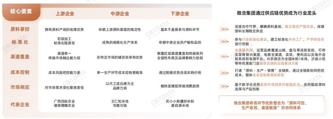 这背后是米粉企业的核心竞争力从单一环节的绝对性优势转向在完整产业链上的供应链优势整合。从这一维度上来看,在线上线下市占率第一的优势之外,微念集团还通过“原料-生产-销售”一体化运营,有效整合了产业链资源,达成成本优化与效率协同,在米粉产业全链条上确立了其行业龙头的地位。