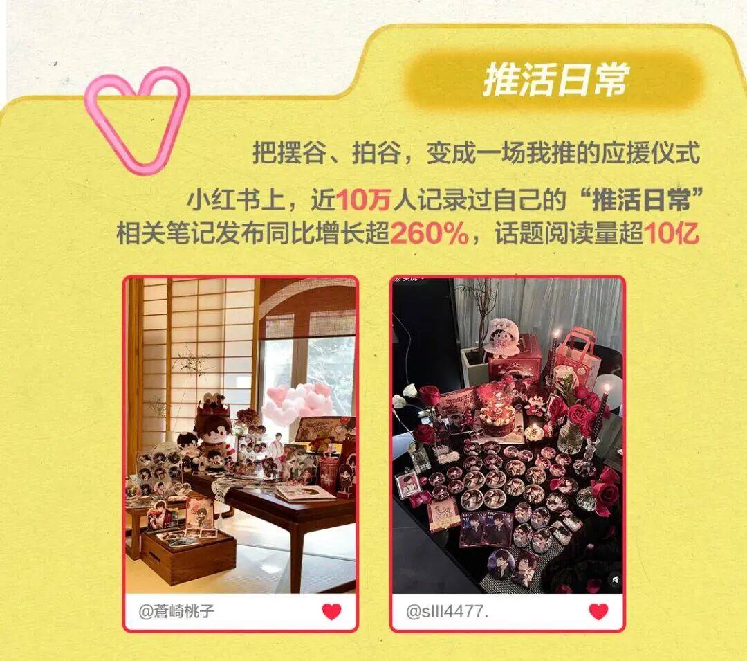 例如报告中写到,在小红书上,有10万年轻人为角色“推活”,相关笔记一年间增长超过260%;“带着谷子去旅行”相关笔记数量超8万,话题阅读量超2亿;还有二次元爱好者把动漫圣地巡礼作为旅行目的,相关话题累计阅读量超过12亿。