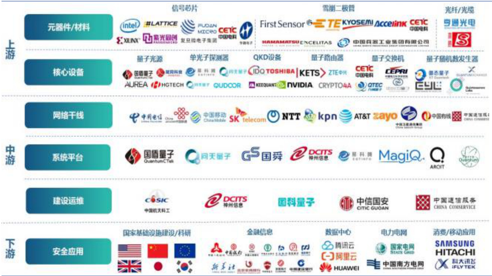 量子通信是未来的一个方向,可以先储备起来,英伟达最近连续投了两家量子通信公司。 量子通信产业链以量子密钥分发(QKD)为核心技术,覆盖上游组件/材料、中游网络/系统集成和下游应用服务环节。中国在全球量子通信领域占据领先地位,专利占比达93% ,政策支持加速商业化落地。以下是基于最新信息的全景图梳理和变化分析: 一、量子通信产业链全景图 产业链分为上游、中游、下游三大层级,涵盖硬件制造、系统集成到应用服务。具体结构如下表(核心环节及代表企业): 层级 关键环节 主要内容及代表企业 代表性产品或技术