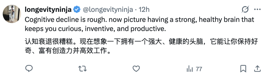 但他们强调的并非要将人均预期寿命从78岁提高到88岁,而是试图开发创新疗法,让人们在生命终结前始终保持健康、警觉和活力。