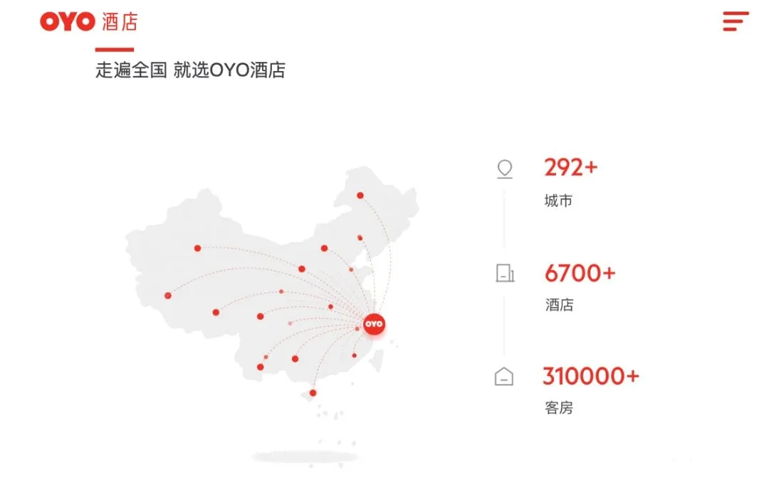 据了解,当年OYO中国官网明确展示了OYO中国的进驻城市、酒店和客房的总数量:城市292+;酒店6700+;客房310000+。