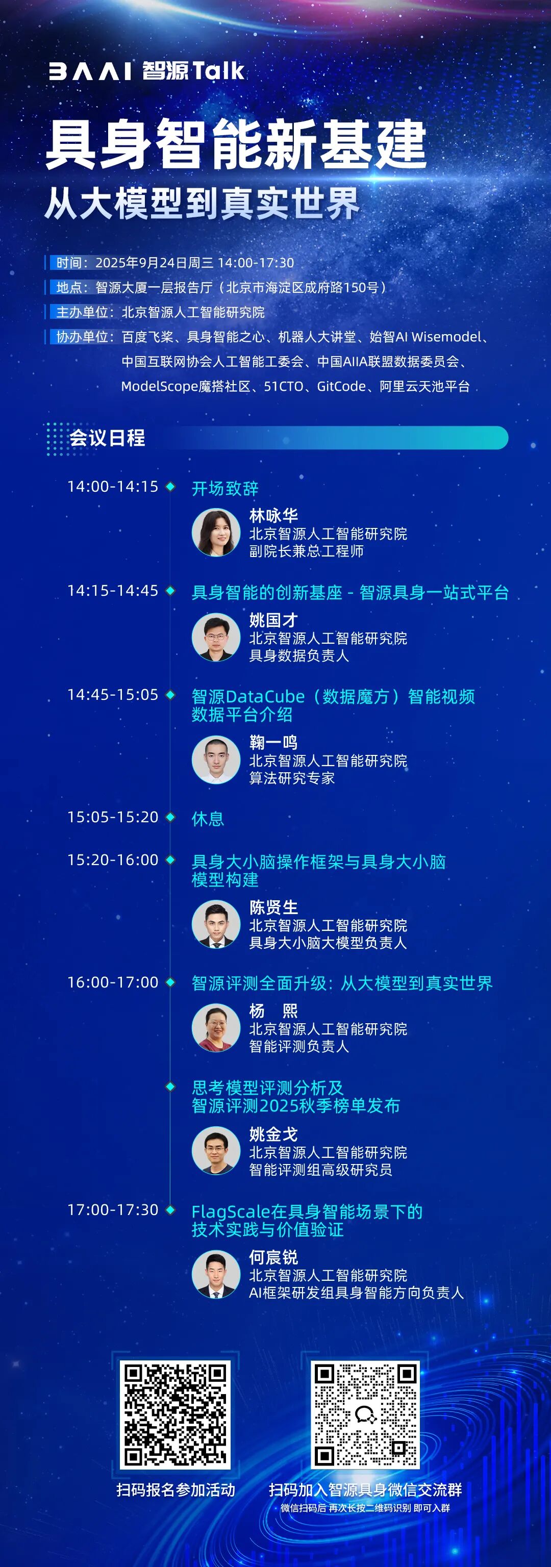 9月24日(周三)下午,北京智源人工智能研究院将举办具身智能新基建Workshop,带您了解智源具身智能领域最新的工作进展
