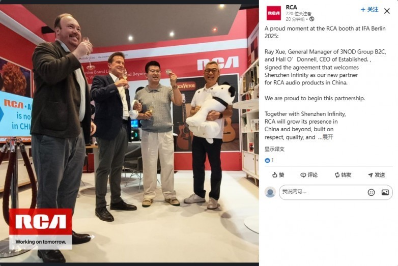 展会签约现场● RCA:自20世纪20年代初首批收音机风靡全美以来,RCA就已融入人们的生活,为人类传播进步做出过重大贡献。本次登陆中国,RCA将凭借百年品牌资产与核心技术,重点接入中国AI技术,与合作伙伴联合开发“经典复刻+智能创新”的差异化音频产品。● 悦享无限(INFINITY):RCA大音频类中国区域及拉美区域国家级品牌战略合作伙伴,系一站式全球品牌生态服务商,为品牌提供定位策划、用户洞察、产品开发、市场渠道拓展及售后等一站式服务,成功服务PHILIPS、魔声、LOCK&LOCK、JEEP、华为等国际品牌战略转型与增长,为合作伙伴累计实现零售额超 30 亿,持续释放商业势能。● 三诺集团:RCA大音频类中国区域及拉美区域研发生产合作伙伴,依托30年音频研发制造经验,主导产品技术落地,提供从声学调校到智能制造的全链路支持,是JBL、哈曼、联想、百度、天猫等知名品牌的生产合作商;悦享无限高层在IFA展会上向外界表露:“RCA的品牌影响力与技术底蕴不言而喻,而悦享无限在品牌生态服务的能力可以快速帮助RCA在中国获得新的市场认可,协助RCA实现‘全球品质、本地适配’。从产品设计到市场落地,双方将共同打造真正懂中国用户的音频产品。”百年传奇焕新:让“RCA之声”传遍中国RCA是电子行业最知名的品牌之一,100 多年来一直提供创新且可靠的技术,为众多家庭带来欢乐。全球消费者都信赖 RCA 品牌,因为它所提供的产品和服务拥有最新的技术与设计,使用便捷,并且能带来最高的价值和长久的使用寿命。一代又一代的家庭在家庭娱乐和生活方式方面始终信赖 RCA 品牌。RCA 是established.inc.的全球商标。