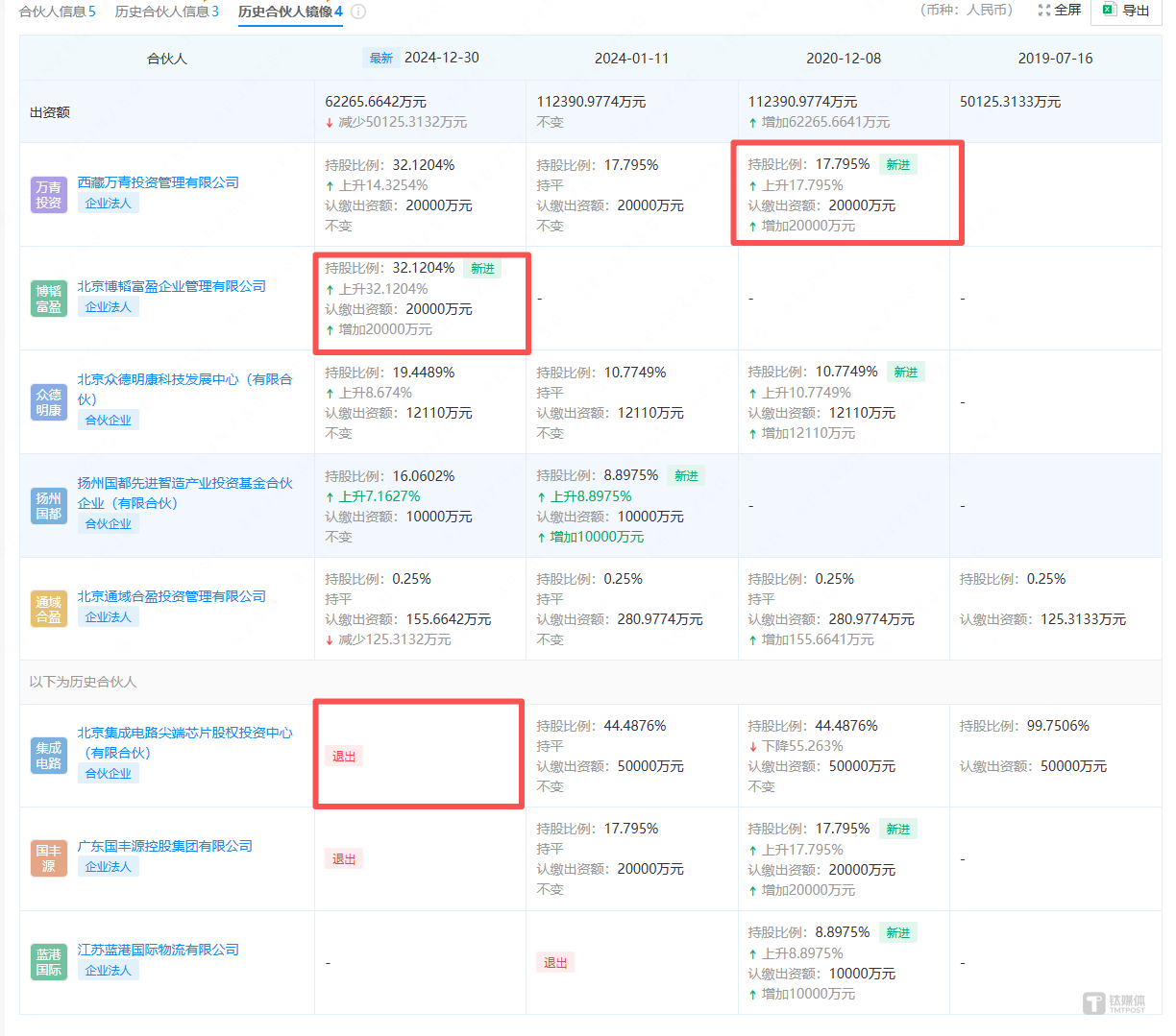 重要的转折点出现在2024年底。通州国资委背景的通州房地产将其持有的通域合盈40%股权转让给了西藏万青。几乎同时,通州国资委背景的北京集成电路尖端芯片基金退出了其在通域基金的份额。黄涛则通过其关联公司博韬富盈(深圳)投资合伙企业(有限合伙)(以下简称“博韬富盈”)追加认购了2亿元的通域基金份额。