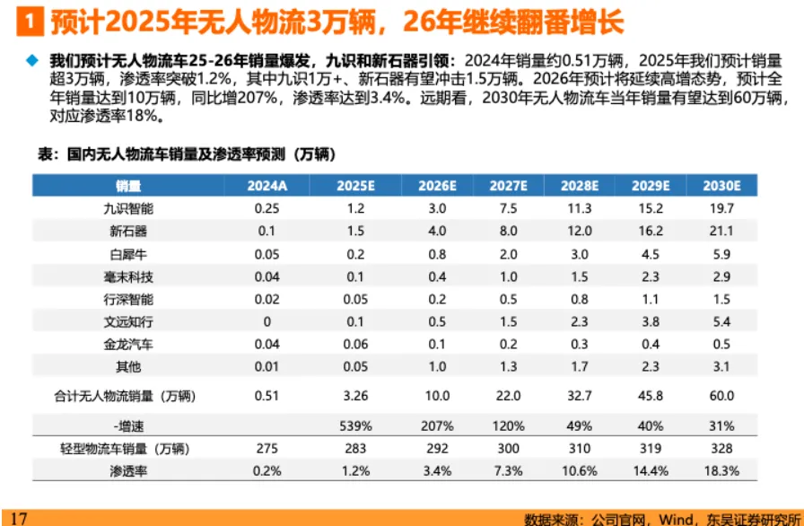 据低速无人驾驶产业联盟数据,2024年我国无人配送车出货量约6600台,而2025年上半年交付量即突破1.2万台。随着老玩家出货量提高以及新玩家的入局,无人配送车下半年将进一步提速。东吴证券预测,2025年无人配送车销量将超3万台。