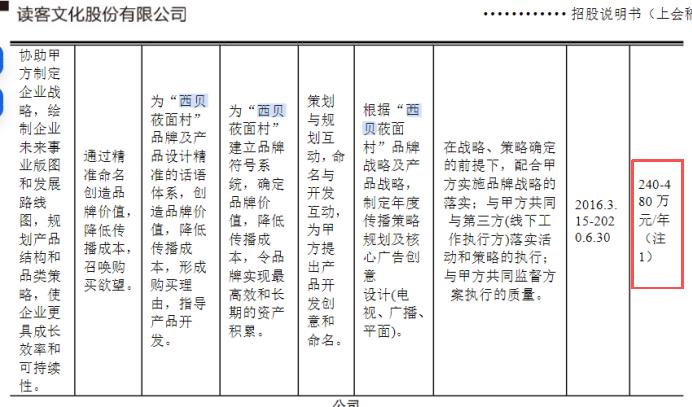 此外,雷达财经注意到,由华杉、华楠实控的上市公司读客文化也曾在招股书中披露,西贝和华与华签订的合同金额为240万元至480万元/年,服务期为2016年3月15日到2020年6月30日。