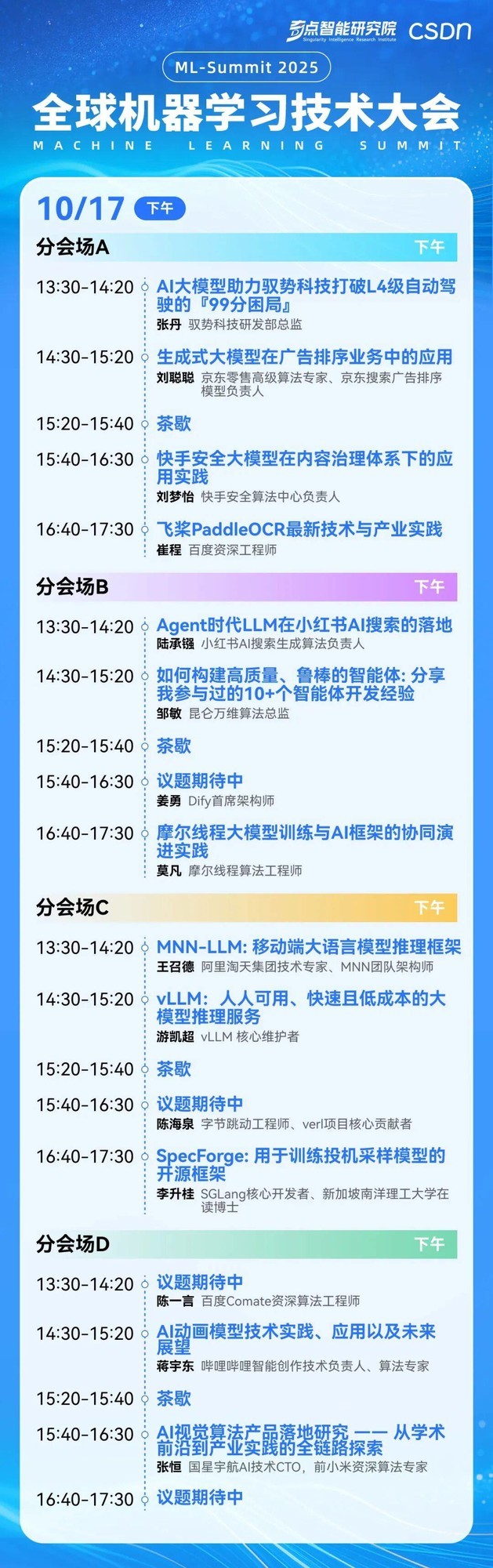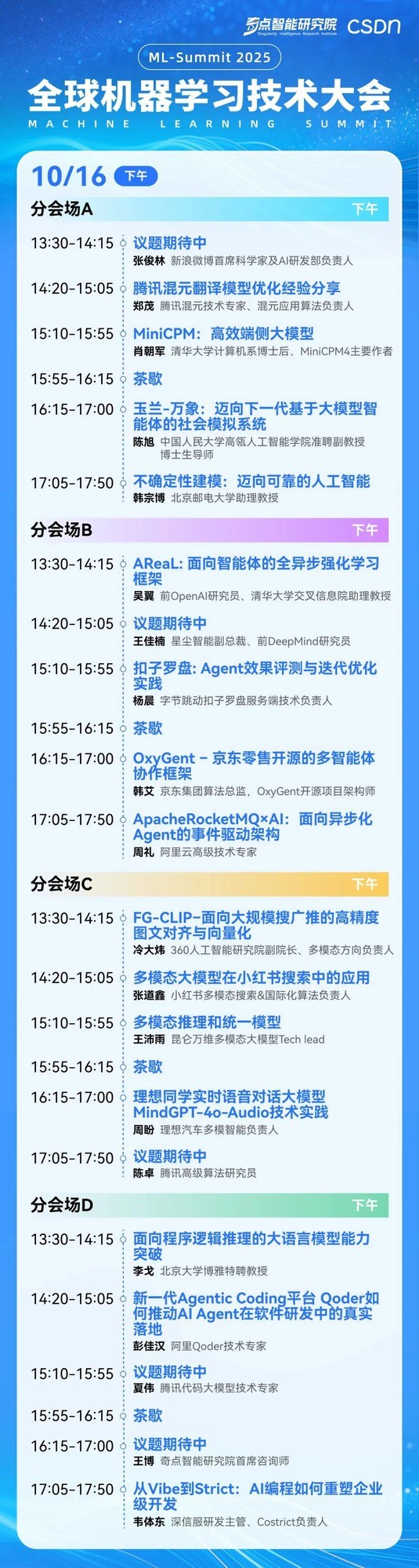 Transformer 共同发明人 Lukasz Kaiser作为现任 OpenAI 资深研究科学家,他将最前沿的理论与实践紧密结合。在本次大会主会上,Lukasz Kaiser 将以《推理模型的历史、现在与未来》 为主题,带领大家回顾推理模型的发展轨迹,剖析当前的技术进展,并展望未来的可能路径。他将结合自身的研究与实践,带来对大模型发展与未来计算范式的最新思考,为整个大会奠定技术与思想的前沿基调。与此同时,奇点智能研究院院长、CSDN 高级副总裁李建忠将带来《大模型技术思考与 AI 产业范式洞察》的主题演讲。他长期致力于推动 AI 基础研究与产业落地的双向融合,为研究与产业之间架起桥梁。李建忠将深入剖析大模型对计算、开发和交互范式的重塑,解读智能体平台、操作系统及互联网生态的未来发展。他的分享将为大会提供战略与技术的全景视角,助力与会者洞察 AI 时代的无限可能。此外,大会上午场还将邀请多位行业领军者深度探讨大模型技术的最新发展与商业化挑战,为 AI 未来的演进提供前瞻视角。一线 AI 技术专家齐聚 共探前沿落地实践在 10 月 16 日的下午,大会现场将设有大语言模型技术演进、智能体工程与实践、多模态与世界模型、AI 赋能软件开发与氛围编程等多个专题的深度对话与实践分享。前 OpenAI 研究员、清华大学交叉信息院助理教授吴翼,星尘智能副总裁、前 DeepMind 研究员王佳楠,新浪微博首席科学家及 AI 研发部负责人张俊林,北京大学博雅特聘教授李戈,腾讯混元技术专家、混元应用算法负责人郑茂,小红书多模态搜索&国际化算法负责人张道鑫,理想汽车多模智能负责人周盼,昆仑万维多模态大模型 Tech lead 王沛雨,阿里 Qoder 技术专家彭佳汉等众多行业领军人物,将带来各自领域的最新突破与独家洞察,共同探索 AI 技术落地与产业创新的前沿路径。以下是 10 月 16 日的下午场的整体日程: