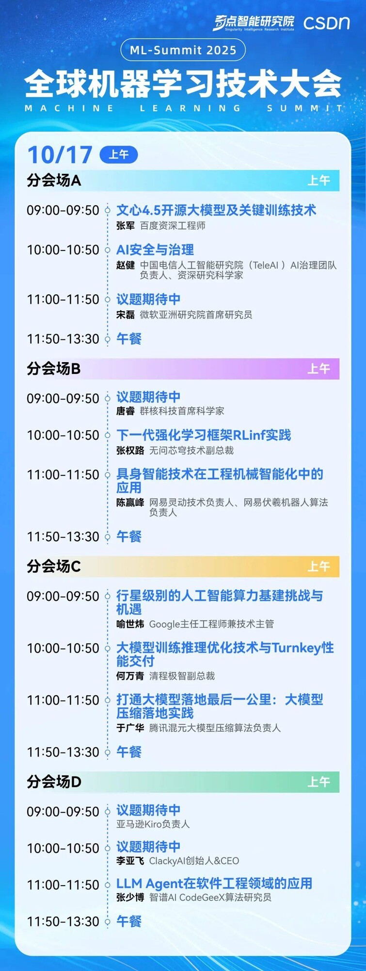 正是在这种历史周期的加速交替与范式转换背景下,由 CSDN 与奇点智能研究院联合举办的 2025 全球机器学习技术大会将于 10 月 16–17 日在北京威斯汀酒店召开,届时全球顶级学者与产业领袖将齐聚一堂。在这里,我们将不再仅仅停留在对未来的想象,而是与 50 余位顶尖专家一道,深度剖析这些核心命题,共同探索 AI 时代的无限可能。