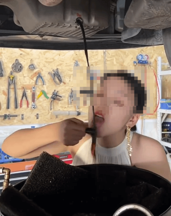 一段视频中,一辆汽车正在排放机油,画面里一名女子竟直接张口接住流出的机油进行品尝,并声称要通过这种方式“诊断”车辆状况。她随后一本正经地分析:“这是壳牌全合成机油,已经行驶8000公里,还能再跑2000公里。”接着又连续两次接取机油品尝,称车辆“燃烧不充分,火花塞可能老化,积碳较多”,甚至进一步判断车辆使用的是92号汽油,并认为汽油滤芯需要更换。