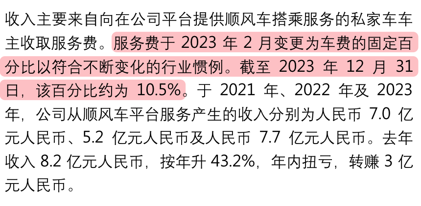 比如嘀嗒顺风车从2017年到2019年,平均服务费率从4.1%提升至6.3%。从2020到2023年初,嘀嗒开始从低比例浮动向固定比例过渡。自2023年2月之后,抽佣费用更是固定为车费的10.5%。