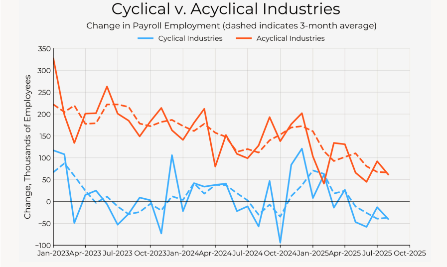 周期性行业就业已经非常糟糕,非周期性行业还好一点。这张图应该可以给鲍威尔一些安慰,因为周期性行业的定义之一,就是更容易被刺激的,就像上图里面,蓝色线条比另一个更加波动,所以理论上来说,降息可以刺激周期性行业的招聘增加。