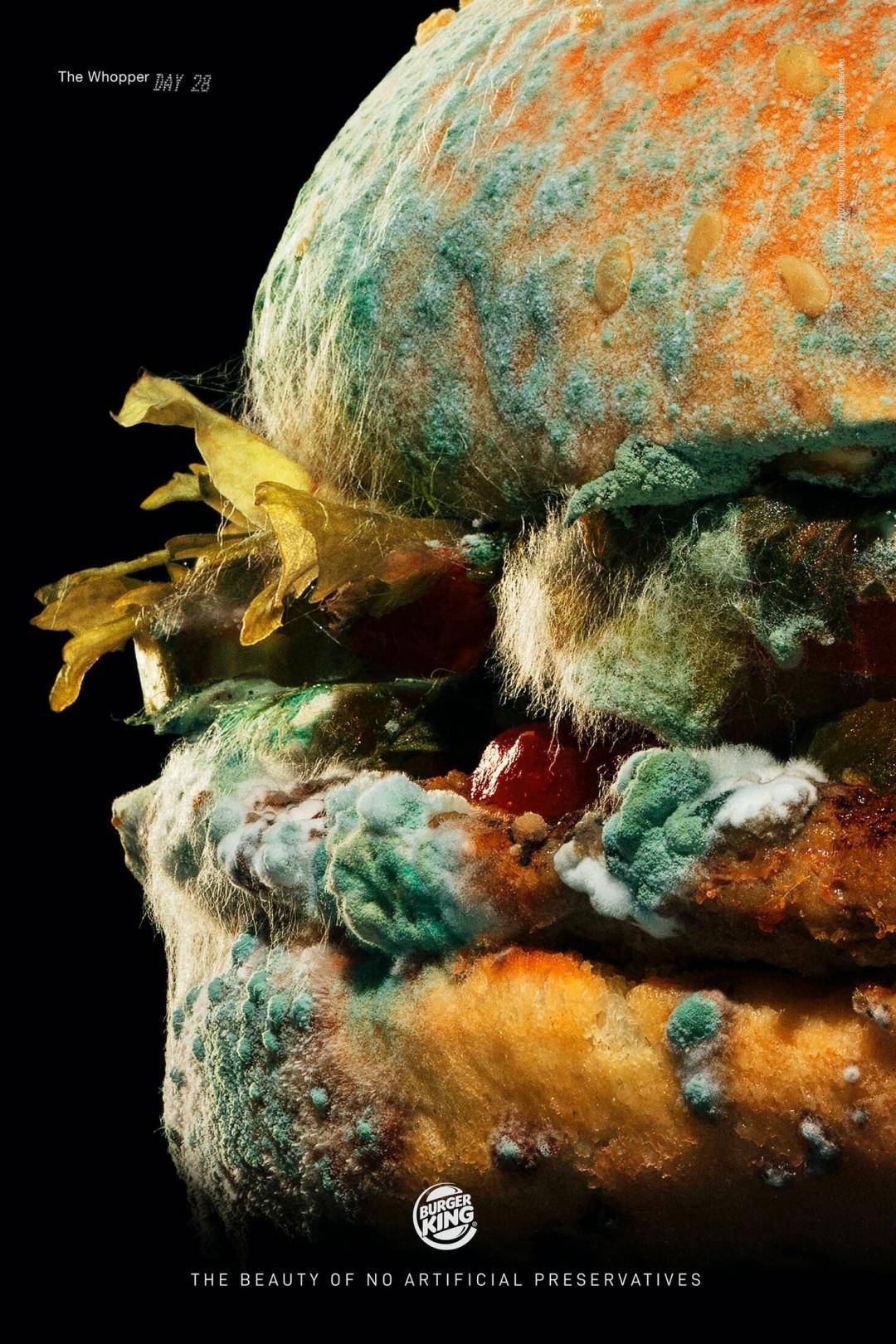 他们来了个反直觉的操作:拍了一支广告,把一个 Whopper 汉堡摆在镜头下,不动,34 天,直到它慢慢发霉、塌掉、长满毛。