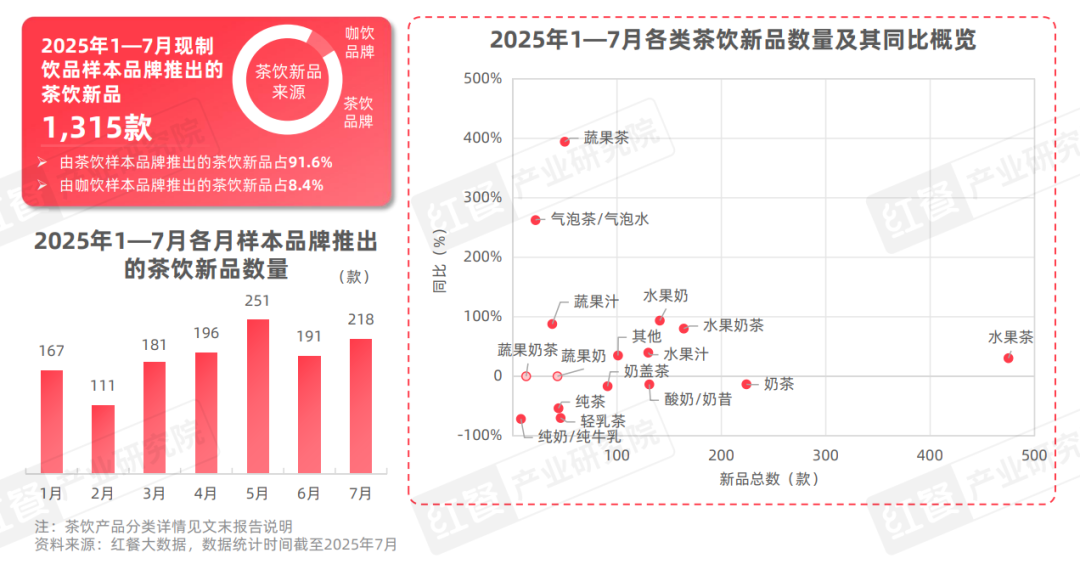 红餐产业研究院2025年1—7月录得现制饮品样本品牌共推出1,315款茶饮新品,其中91.6%的茶饮新品来自茶饮样本品牌,而咖饮样本品牌亦贡献了8.4%。