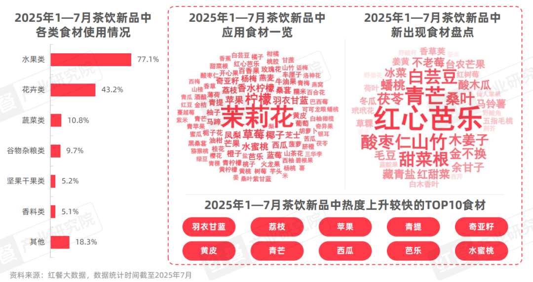 整体上看,2025年 1—7 月的茶饮新品在风味上呈现出“茶香奠基、花香提亮、果香赋能”的特征。茶香通过应用升级与工艺创新实现茶香风味的层次升级;花香则与茶、果、奶灵活融合,兼具香氛感,强化辨识度和情绪价值;果香则从清爽口感转向健康功能,叠加果蔬、营养成分和多重口感结构,满足营养与能量补给需求。
