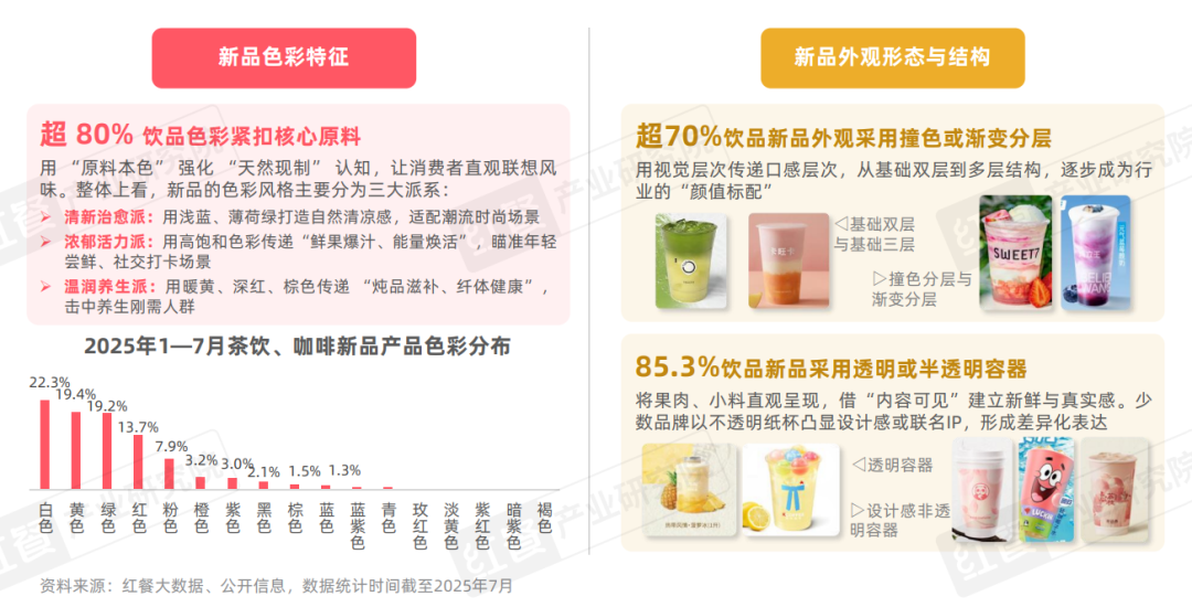 2025年1—7月的茶饮、咖啡新品外观特征已从“单纯好看”进化到“颜值+价值+传播”三位一体,新品外观既建立品质信任,又承载情绪共鸣与社交传播,成为品牌竞争的重要维度。