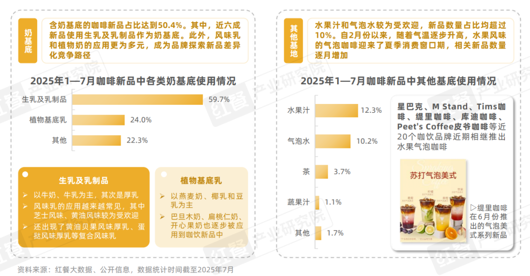 在咖啡新品的奶基底应用中,生乳及乳制品仍为核心,但品牌已将其从单一口感承载转向多元风味创新,通过芝士、黄油等风味乳强化产品个性和产品溢价延展。此外,植物奶的渗透持续上升,既契合健康与可持续消费趋势,也为新品提供了更多的风味组合。