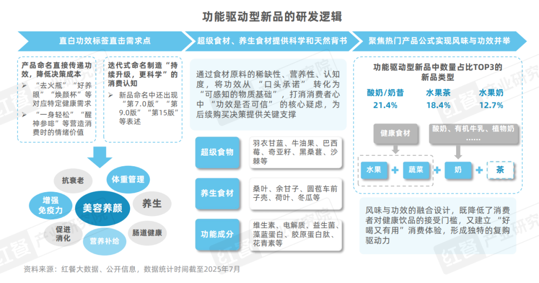 功能驱动型新品则主要通过添加高蛋白、膳食纤维、低糖、益生菌、胶原蛋白等成分,突出“美容养颜”“增强免疫力”“助消化”等健康功效。其特征是通过明确功能标签,满足年轻消费者对“味道好又有益”的双重期待。